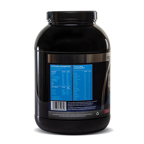 Milk Protein Concentrate (Milk) (80%), L- Glutamine and Glutamine Peptides (Gluten), Micellar Casein (Milk), Whey Protein Concentrate (Milk, Soy Lecithin), Cocoa Powder (in chocolate only), HMB (β-Hydroxy β-Methylbutyrate), Flavouring, Natural Colour (Beta Carotene in Banana and Beetroot Red in Strawberry) MCT (Medium Chain Triglycerides from Coconut Oil), Stabiliser (Xanthan Gum), Sweetener (Sucralose).