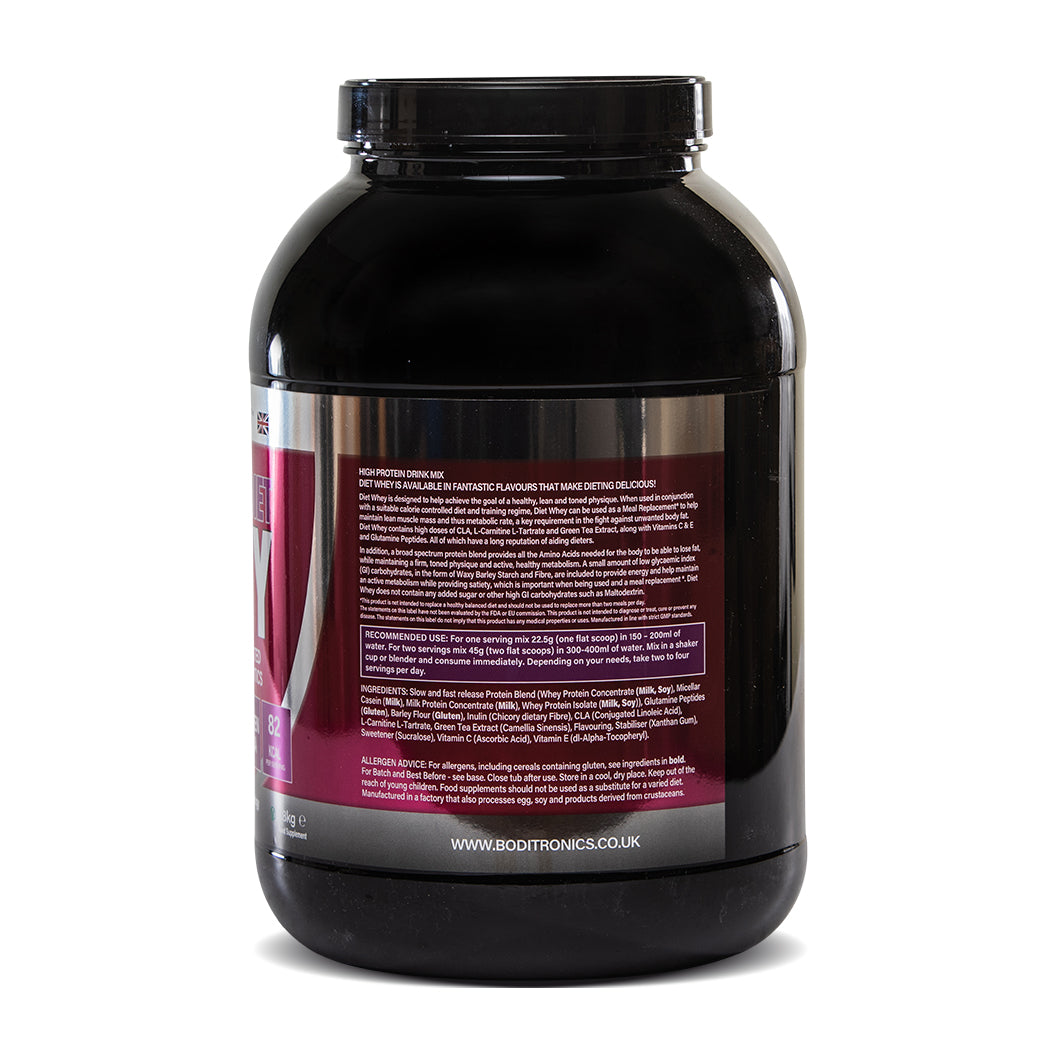 Boditronics Diet Whey is designed to help achieve the goal of a healthy, lean and toned physique. When used in conjunction with a suitable calorie-controlled diet and training regime, Diet Whey can be used as a meal replacement* to help maintain lean muscle mass and thus the metabolic rate, a key requirement in the fight against unwanted body fat.
